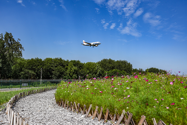 首都機場西跑道北端由北部土坡區(qū)、南部平整區(qū)以及排水明溝等區(qū)域構(gòu)成,總面積約3.3萬平方米。該區(qū)域原為渣土堆,堆放了較多建筑垃圾,容易吸引鳥類停留,環(huán)境治理難度較大。面臨種種挑戰(zhàn),首都機場飛行區(qū)管理部積極創(chuàng)新工作思路,以人工種植的草坪為基底,選擇4種—5種適合北方地區(qū)生長且不吸引鳥類的草種整體分區(qū)種植,并搭配種植小面積波斯菊,在西跑道北端打造了一片花海。