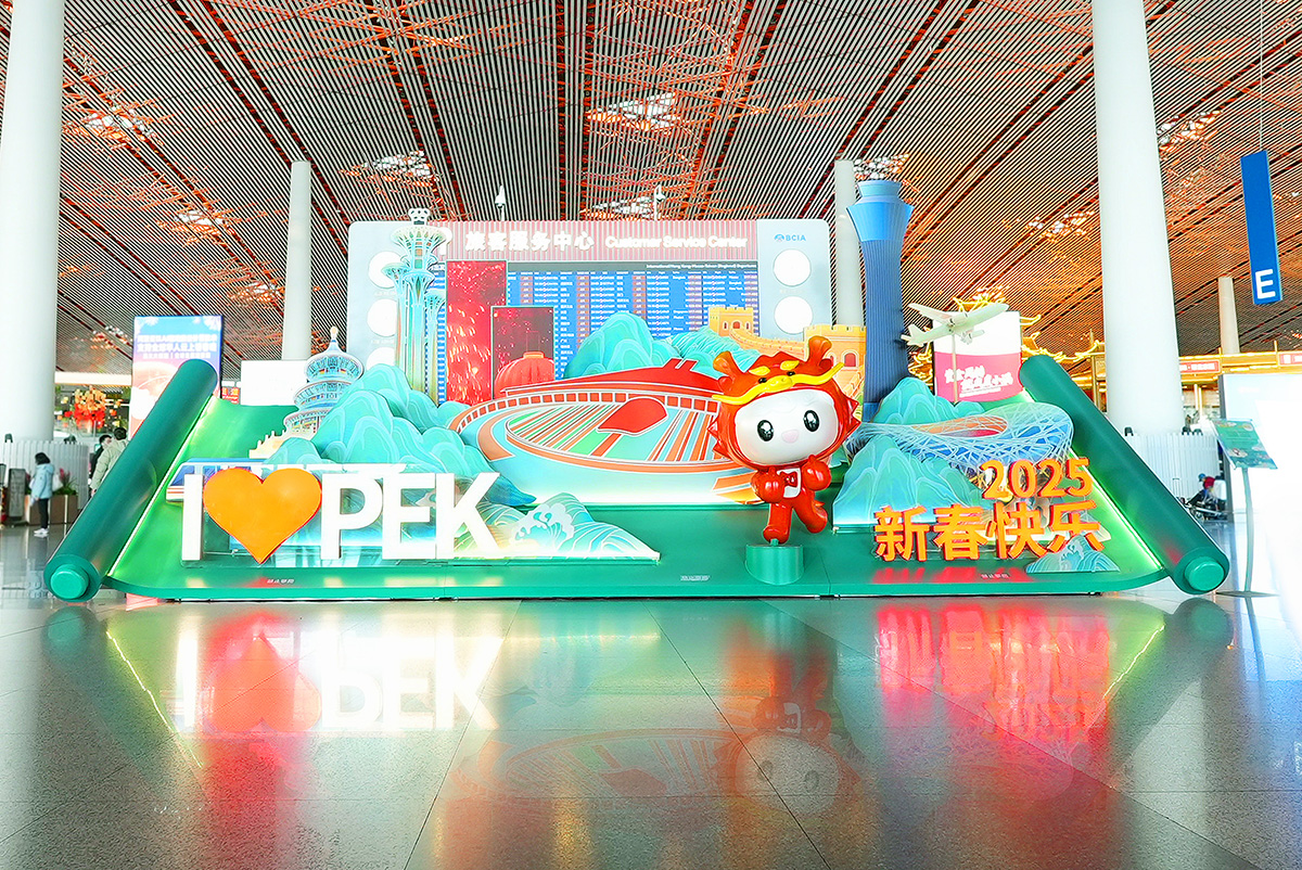 春運(yùn)期間,首都機(jī)場(chǎng)上新樓內(nèi)景觀,為往來(lái)旅客呈現(xiàn)了一場(chǎng)別開生面的視覺(jué)盛宴。在3號(hào)航站樓內(nèi),一幅絢麗的新春畫卷徐徐展開。以綠色卷軸打底,景觀巧妙地融入北京標(biāo)志性建筑,俏皮可愛(ài)的首都機(jī)場(chǎng)服務(wù)品牌IP“都都”和“新春快樂(lè)”4個(gè)大字仿佛在向每一位旅客熱情地打招呼,傳遞最真摯的新春祝福,讓旅客感受到新春的喜悅。
