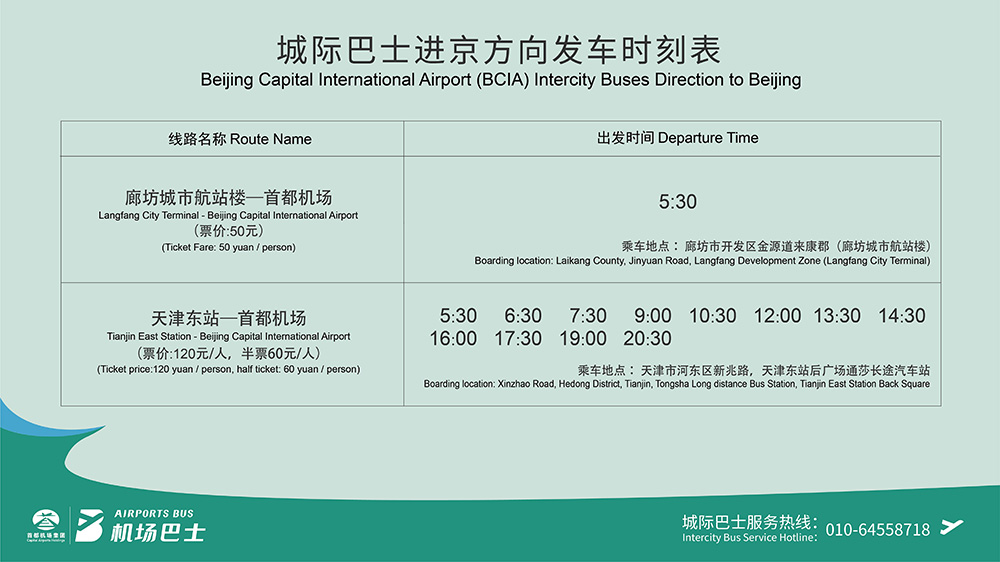 票價:50元(注:持有首都機場進出港航班機票乘客可免費乘坐廊坊城市航站樓機場巴士。廊坊城市航站樓前往首都機場的需持有本人3日內(nèi)有效機票;首都機場前往廊坊城市航站樓的需持有本人24小時內(nèi)機票。)