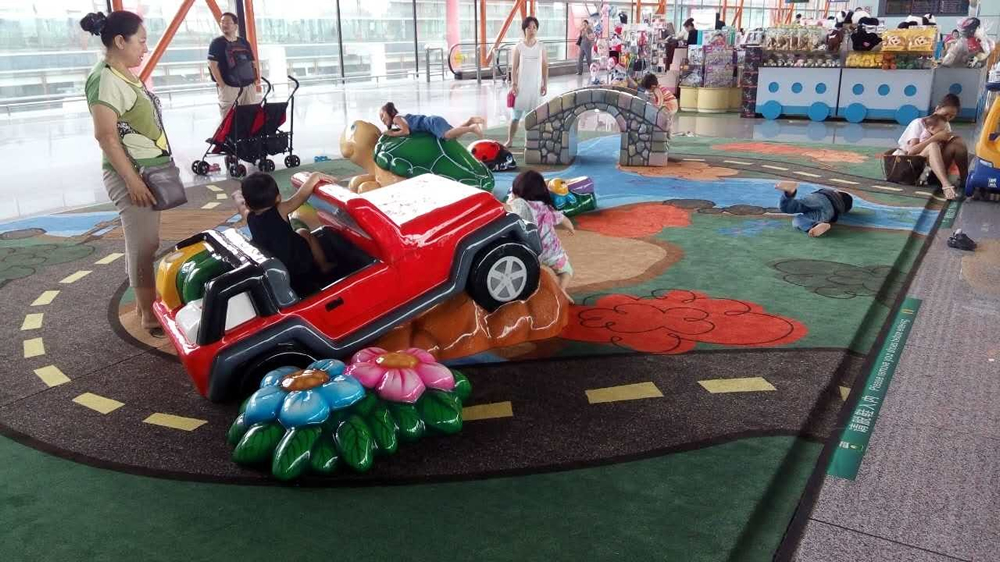 C09登機(jī)口兒童活動區(qū)是以汽車為主題的活動區(qū)域,區(qū)域內(nèi)卡通汽車、海龜分布錯(cuò)落有致,地毯上繪有卡通跑道圖案,整體風(fēng)格活潑、主題性突出。