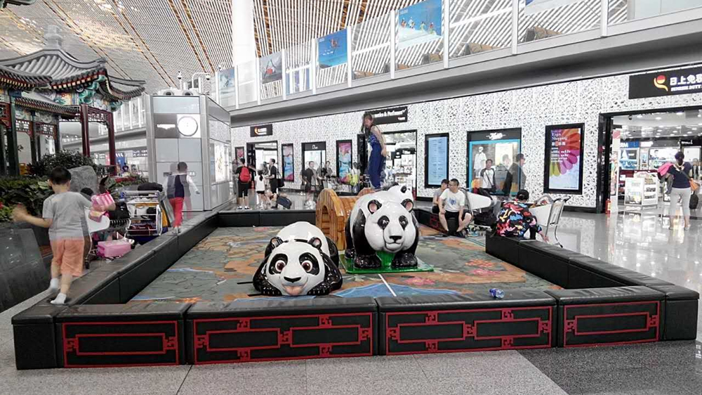E21登機(jī)口的兒童活動區(qū)以中國國寶熊貓為主題建造。樂園內(nèi)憨態(tài)可掬的大熊貓或臥或躺形態(tài)各異,綠色圍墻紅色欄桿與旁邊的中式古建筑相應(yīng)成趣。