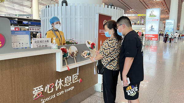 暑運期間,隨著老年旅客和兒童旅客的增加,首都機場航站樓暖陽團隊在每個柜臺配備了飲用水、藿香正氣水、風(fēng)油精、十滴水等清涼解暑物品,供有需要的旅客使用。同時,團隊成員充分發(fā)揮自己的想象力和主動性,DIY 出獨具特色的團扇,贈送給前來愛心休息區(qū)休息的老年旅客,得到了旅客們的一致好評:“扇子非常精美,也很有意義。在疫情這個特殊時期也能感受到來自首都機場的濃濃的關(guān)愛,在這炎炎夏季讓我們感受到了絲絲清涼”。