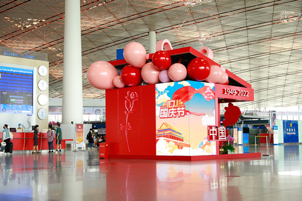 為全面踐行四型機場發(fā)展理念,深化人文機場建設(shè),在國慶節(jié)、重陽節(jié)到來之際,首都機場精心打造“‘禮’贊中華,情寄家國”主題系列節(jié)日景觀,為旅客送上溫馨的節(jié)日祝福。